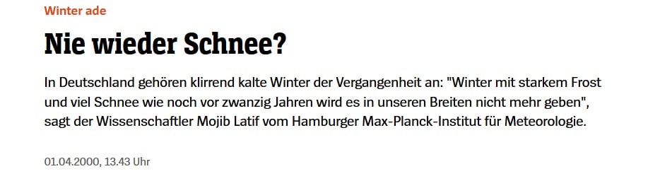 Vor über 25 Jahren jubelte der Spiegel: „Winter ade – nie wieder Schnee!“ Klimaexperte Mojib Latif prophezeite 2000 klipp und klar: „Winter mit starkem Frost und viel Schnee wie noch vor zwanzig Jahren wird es in unseren Breiten nicht mehr geben.“