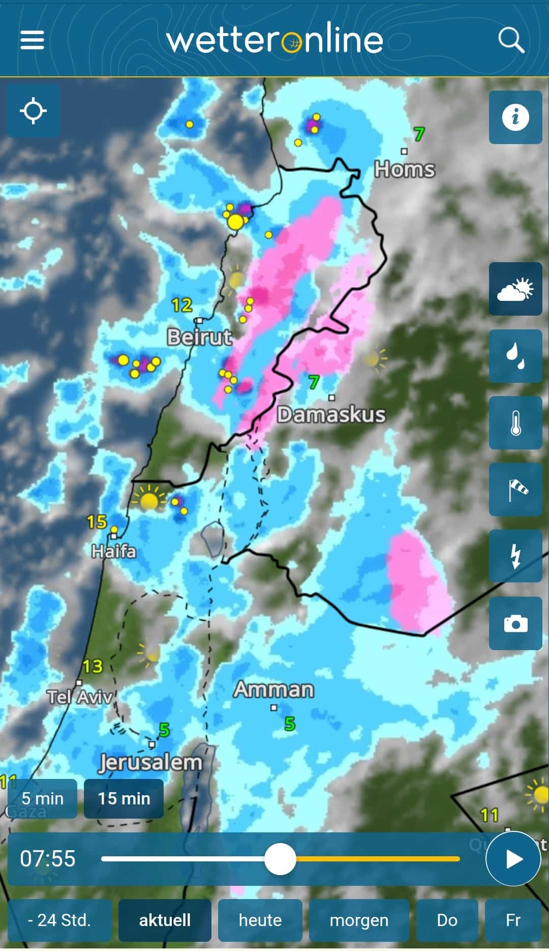 Wetter-Apps erlauben uns heute, einen Blick rund um die Welt zu werfen: Im Libanon regnet und schneit es (siehe Screenshot) abwechselnd, in Sibirien herrschen Temperaturen von bis zu -35 °C (Irkutsk), selbst die mongolische Hauptstadt Ulaanbaatar friert bei -20°C.